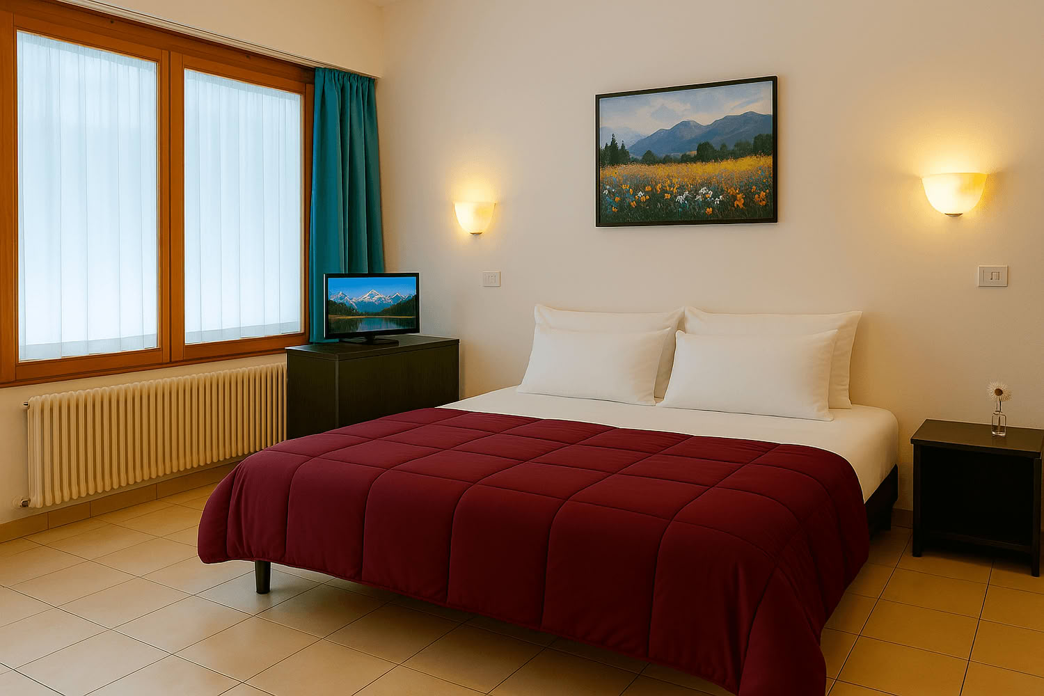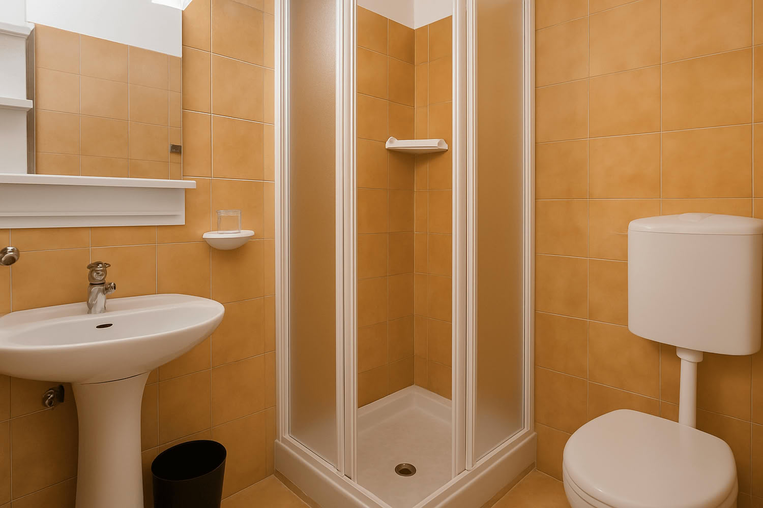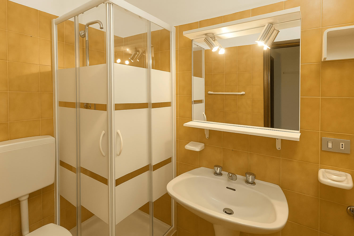 Vano unico con letto matrimoniale e letto a castello, separato parzialmente da un armadio, angolo cottura attrezzato, tv color, bagno con doccia, wc e lavandino (senza moquettes). Circa 25mq.