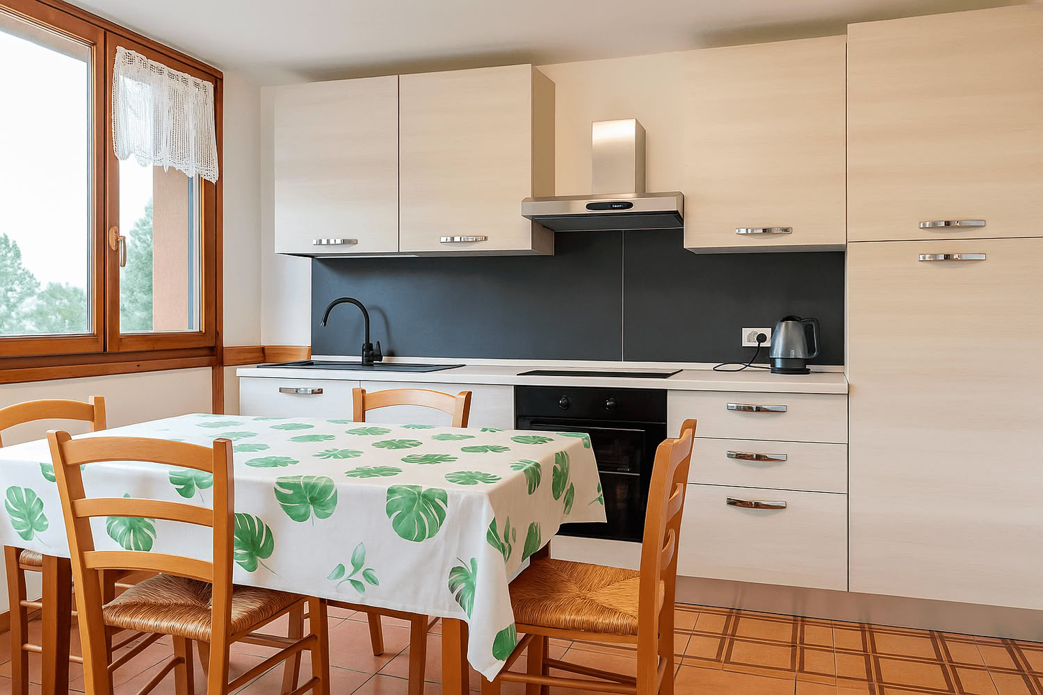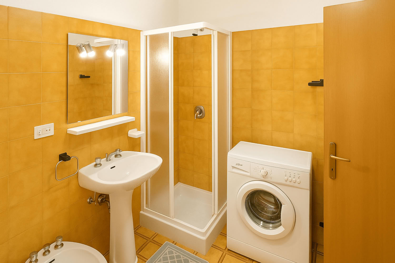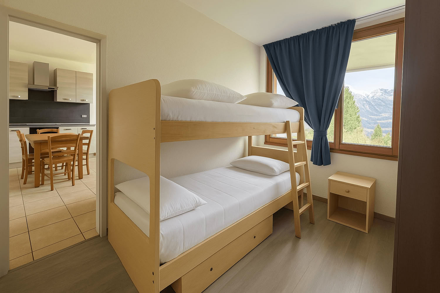 Soggiorno con angolo cottura attrezzato, tv color e divano-letto matrimoniale, cameretta con due letti singoli, camera da letto matrimoniale, letto a castello tra camere e soggiorno, bagno con doccia, wc, bidet, lavandino e lavatrice.