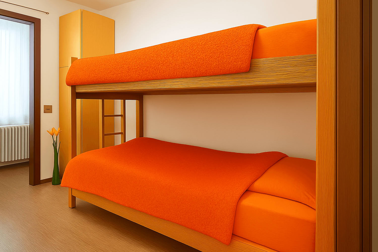 L’entrata รจ direttamente dal giardino, offre due spaziose camere da letto matrimoniali, di cui una con letto aggiunto ed una camera con letto a castello.