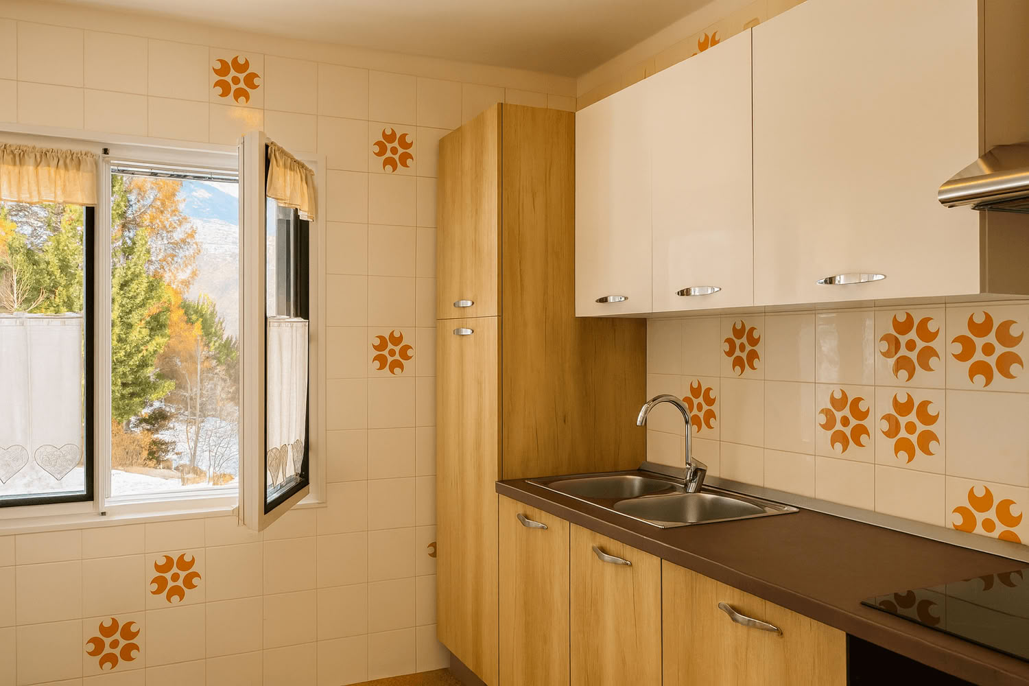 Cucina attrezzata, lavastoviglie, grande soggiorno con tv color e divano-letto matrimoniale, bagno con lavandino, wc, bidet, box doccia.
