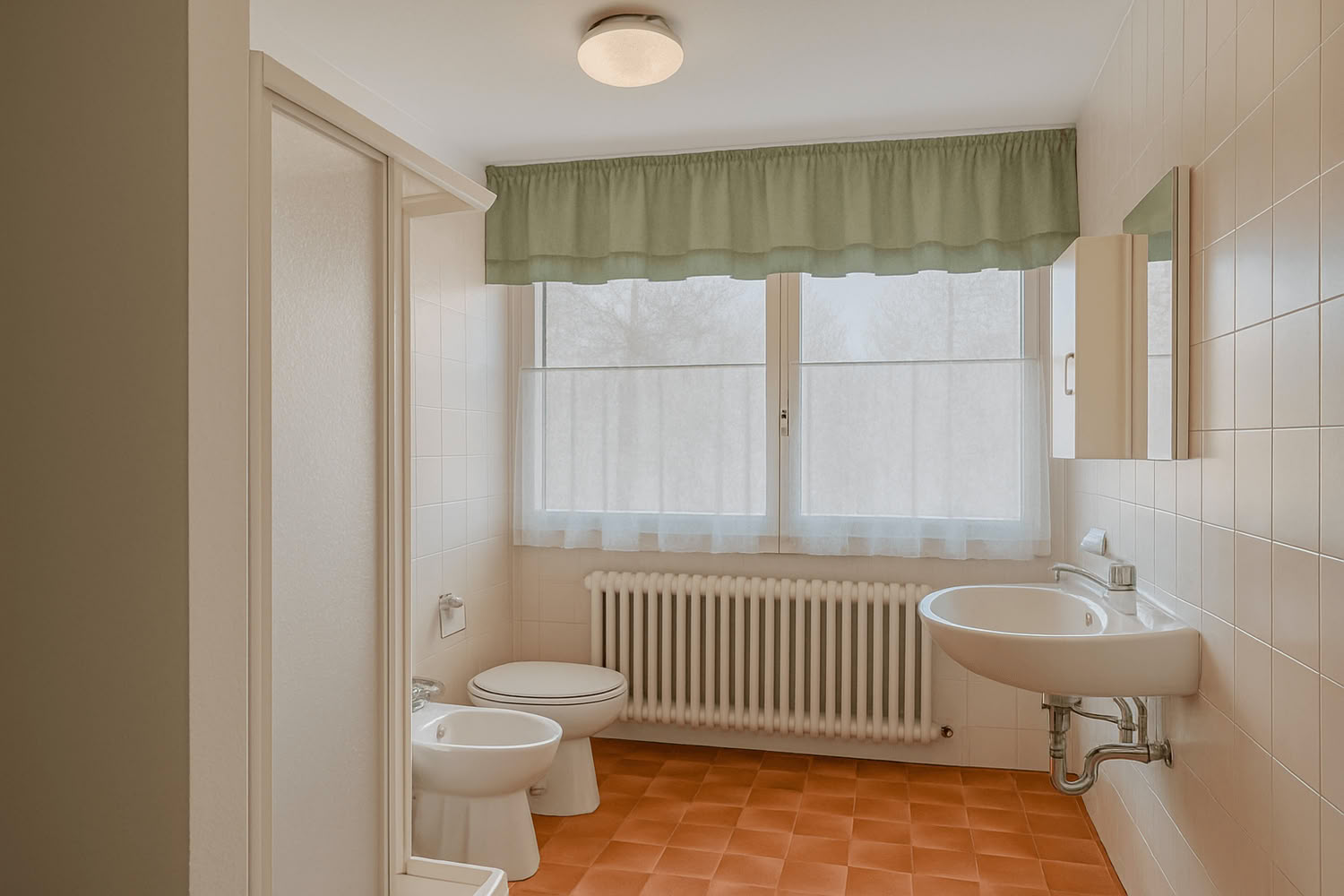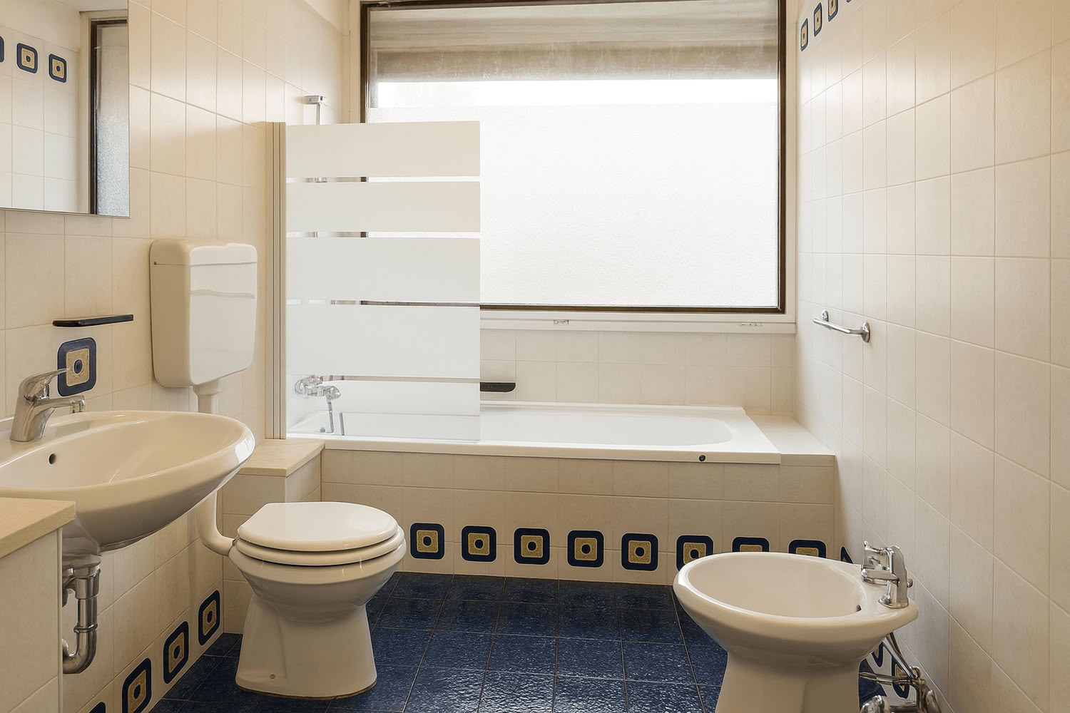 Cucina attrezzata e lavastoviglie, bagno con lavandino, wc, bidet, vasca.